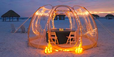 Enjoy a magical night on Marco Island in a twinkling beachside igloo for up to 6 guests, complete with Adirondack chairs, non-alcoholic drinks, water, and a mini Bluetooth speaker to take home. Food can be ordered from a limited menu.