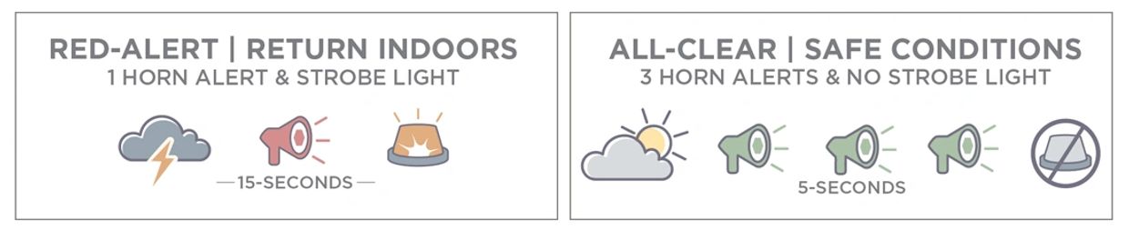 When the live weather station detects inclement weather, the system will initiate a horn cluster and strobe light alert: