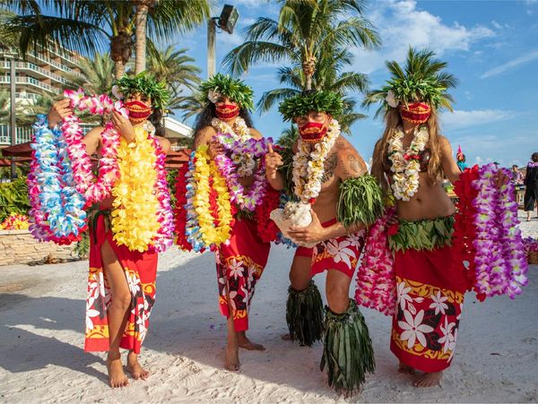 Feel the spirit of the Pacific Islands at our Sunset Luau on the beach! Enjoy a traditional Lei greeting, a welcome cocktail, and Hawaiian dinner specialties. A high-energy hula show will feature authentic South Pacific performances and a lively cast. Join us on an island-hopping journey celebrating history and traditions. There will be opportunities for photos and audience participation, such as a limbo contest or a hula lesson.